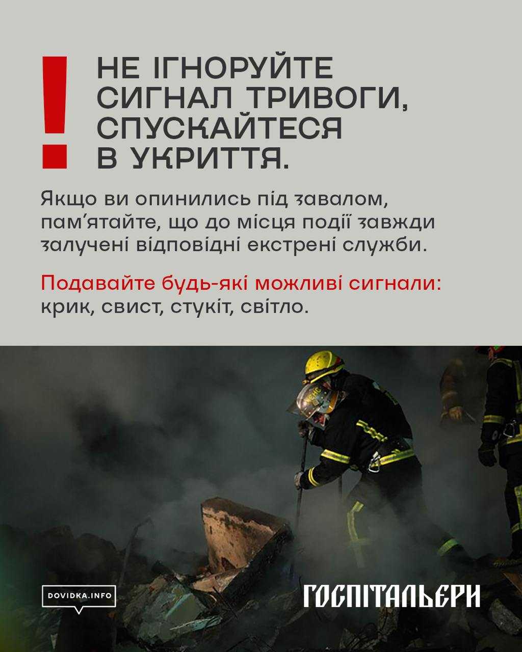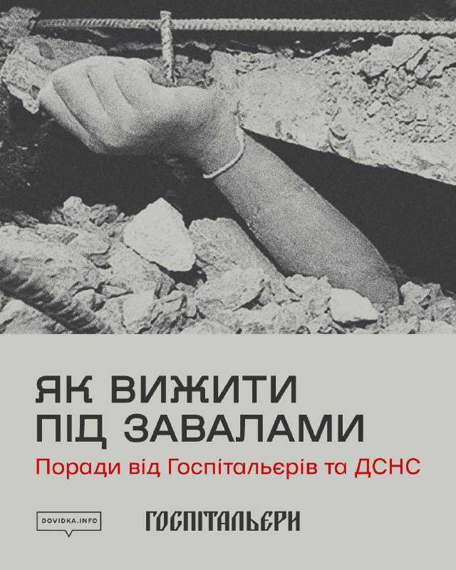 Росія посилила авіаобстріли українських міст і сіл. Ворог усе частіше прицільно б’є по житлових кварталах, медичних закладах, укриттях та об’єктах критичної інфраструктури. Під руїнами будинків опиняються цілі родини. Саме тому кожен українець має знати базові правила поведінки у випадку, якщо ви або ваші близькі потрапили під завали. Проєкт Довідка.інфо Центру стратегічних комунікацій та інформаційної безпеки зібрав поради від ДСНС та медичного батальйону «Госпітальєри», перевірені в умовах реальних рятувальних операцій. Ці знання можуть врятувати життя ще до приїзду надзвичайників, а також полегшать їм роботу під час пошуково-рятувальних робіт.
