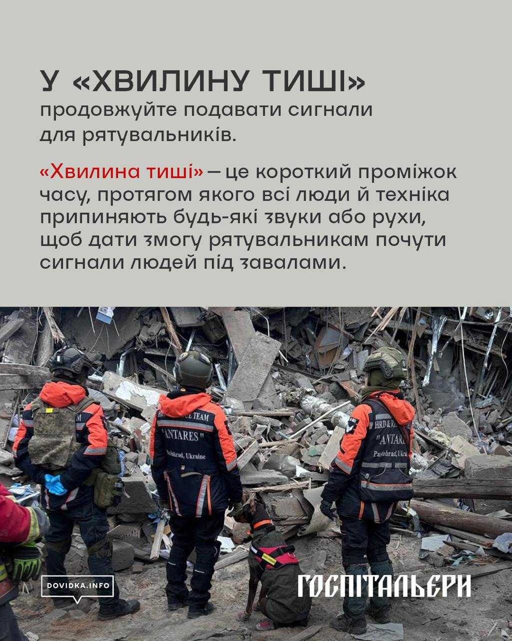 Під час спеціальних «хвилин тиші» вся рятувальна техніка припиняє роботу, аби вловити будь-які звуки з-під завалів. Саме в ці хвилини ваші сигнали можуть стати шансом на порятунок. Якщо ви маєте змогу — не припиняйте подавати звуки в цей період.