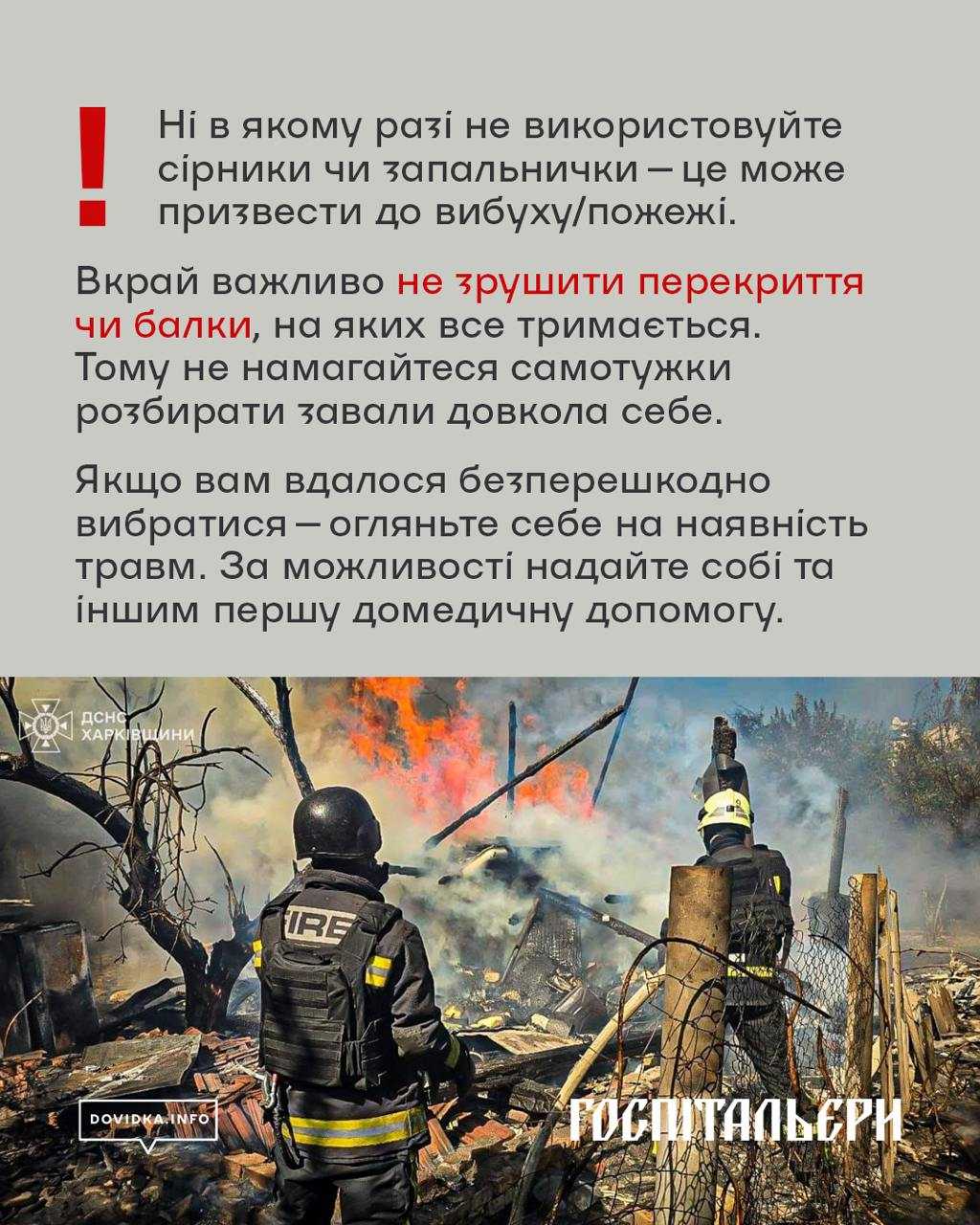 У жодному разі не використовуйте сірники чи запальнички, адже це може призвести до вибуху або пожежі через можливі витоки газу. Уникайте будь-яких спроб самостійно розбирати уламки — це може спричинити обвал всієї конструкції.