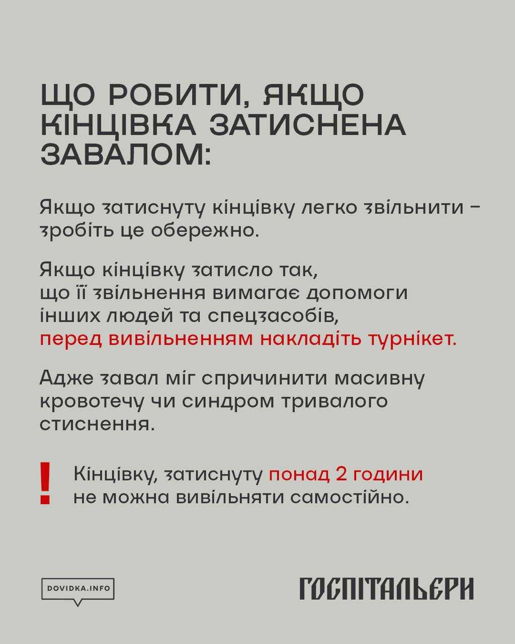 Буває, що під завалами людину затискає уламками конструкцій. Якщо кінцівку можна легко вивільнити — робіть це дуже обережно. Однак якщо кінцівку затиснуло серйозно, і для звільнення потрібна допомога інших людей чи спецзасобів, категорично не можна робити це самостійно без попереднього накладання турнікета. Адже ви можете пошкодити великі судини, що призведе до масивної кровотечі.