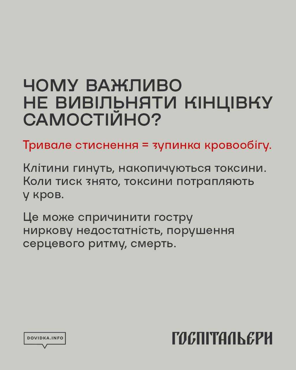 Особливо небезпечною є ситуація, коли кінцівка перебуває під тиском понад 2 години. Тривале стискання призводить до зупинки кровообігу в тканинах, і там накопичуються токсини. Якщо різко зняти тиск — ці токсини потрапляють у кров, що може спровокувати гостру ниркову недостатність, серцеві порушення й навіть смерть.